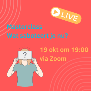 Op 15 oktober is er weer een live masterclass. In deze masterclass neem ik jullie mee door diverse oefeningen en leer jij je 3 grootste saboteurs kennen. Natuurlijk geef ik je ook tips om met je saboteurs te gaan werken in het dagelijks leven.